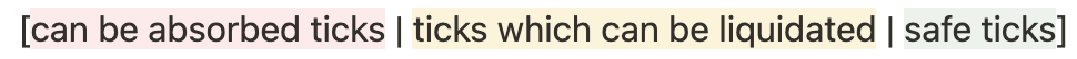 How the yellow part works. Liquidation in Vault is a loop in which the liquidator moves positions from the current most risky non-empty tick to the next non-empty tick. Thus Liquidation loop moves positions to safer and safer ticks, until they all are moved into the liquidation threshold tick.