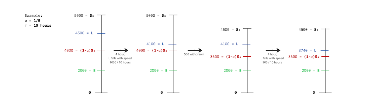 With time only withdrawal limit L changes: L falls until (1-α)S₀, with speed αS₀÷τ