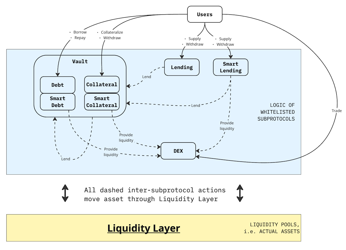 Subprotocols interoperate through Liquidity Layer: for instance, assets supplied via the Lending subprotocol can be borrowed by Vaults subprotocols, while assets supplied via Smart Lending can be both borrowed by Vaults and also used as liquidity for the DEX subprotocol.