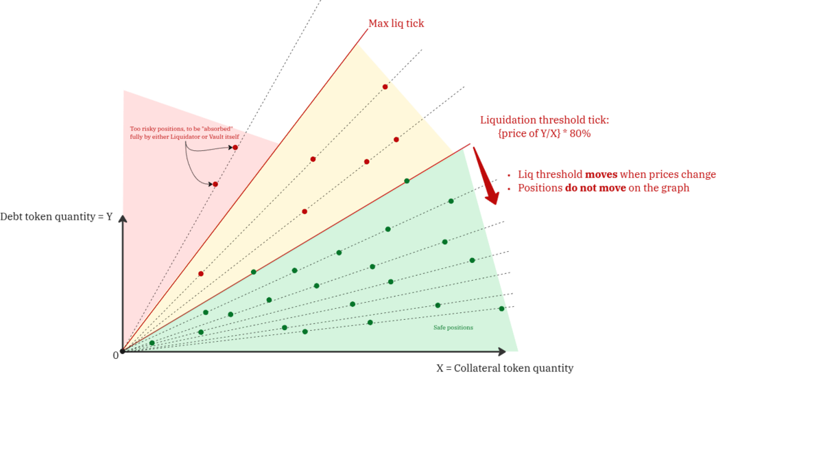 Important thing to note: during price fluctuations user’s position are not being moved, because their ratio stays the same. What changes is the liquidation tick. Liquidation tick represents the ratio above which positions are considered risky, and it is being calculated as current price Y/X * liquidation threshold. For example, for ETH/USDC Vault with current price 4000 and liquidation threshold 88% the liquidation tick would be ~log_{1.0015}(4000 * 0.88 = 3520) = 5448.