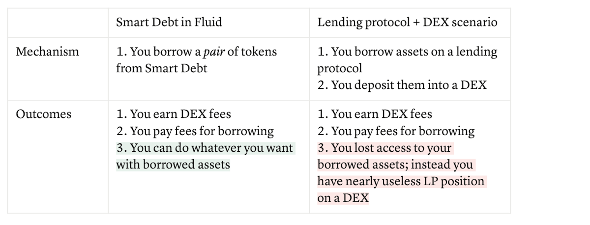 (2) Smart Debt is where Fluid's innovation shines. Users can borrow say USDC-USDT debt and use the borrowed assets however they want (swap to other tokens, deposit to different dApps, or anything else really). Meanwhile, this debt is utilized to perform swaps on the DEX. Because the debt provides liquidity to the DEX and earns trading fees, it reduces the borrowing APR — sometimes even making it negative.