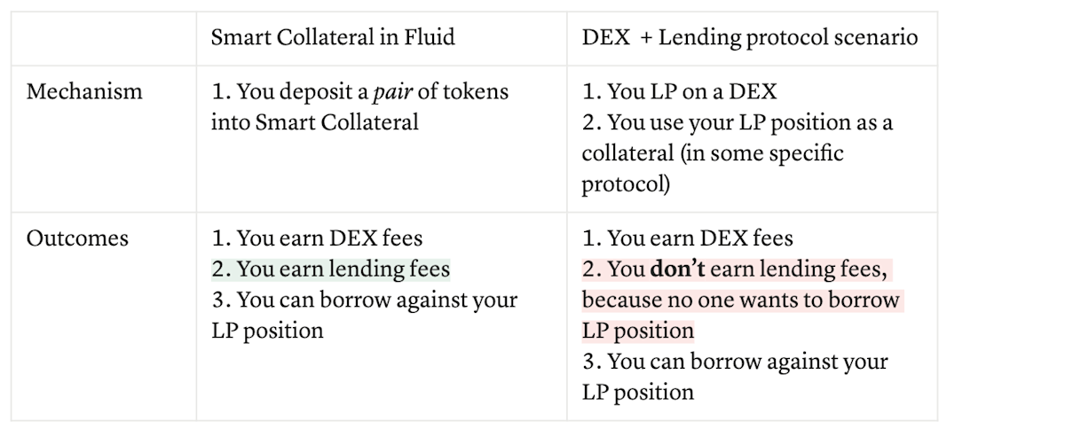 (1) Smart Collateral works much like regular liquidity in DEXs: the user supplies a pair, say USDC-ETH, in some proportions, and as the price changes over time, the token proportions in the pool change. Importantly, LPs additionally earn supply yield from the lending market.