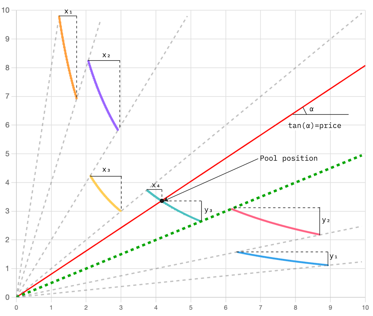 An AMM pool stores a pair of tokens X & Y, whose precise amounts follow the formula x⋅y=k, where x represents the amount of token X and y represents the amount of token Y in the pool. The price in this pool is defined as y/x, because it is equal to the derivative y′(x) — the marginal amount of Y tokens received for one X token.