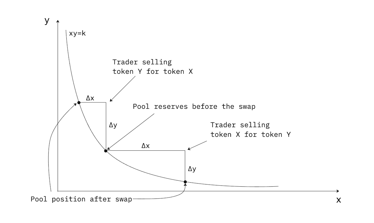 Swaps. During every swap with an input amount Δx, the output amount Δy is such that the constant k is preserved: